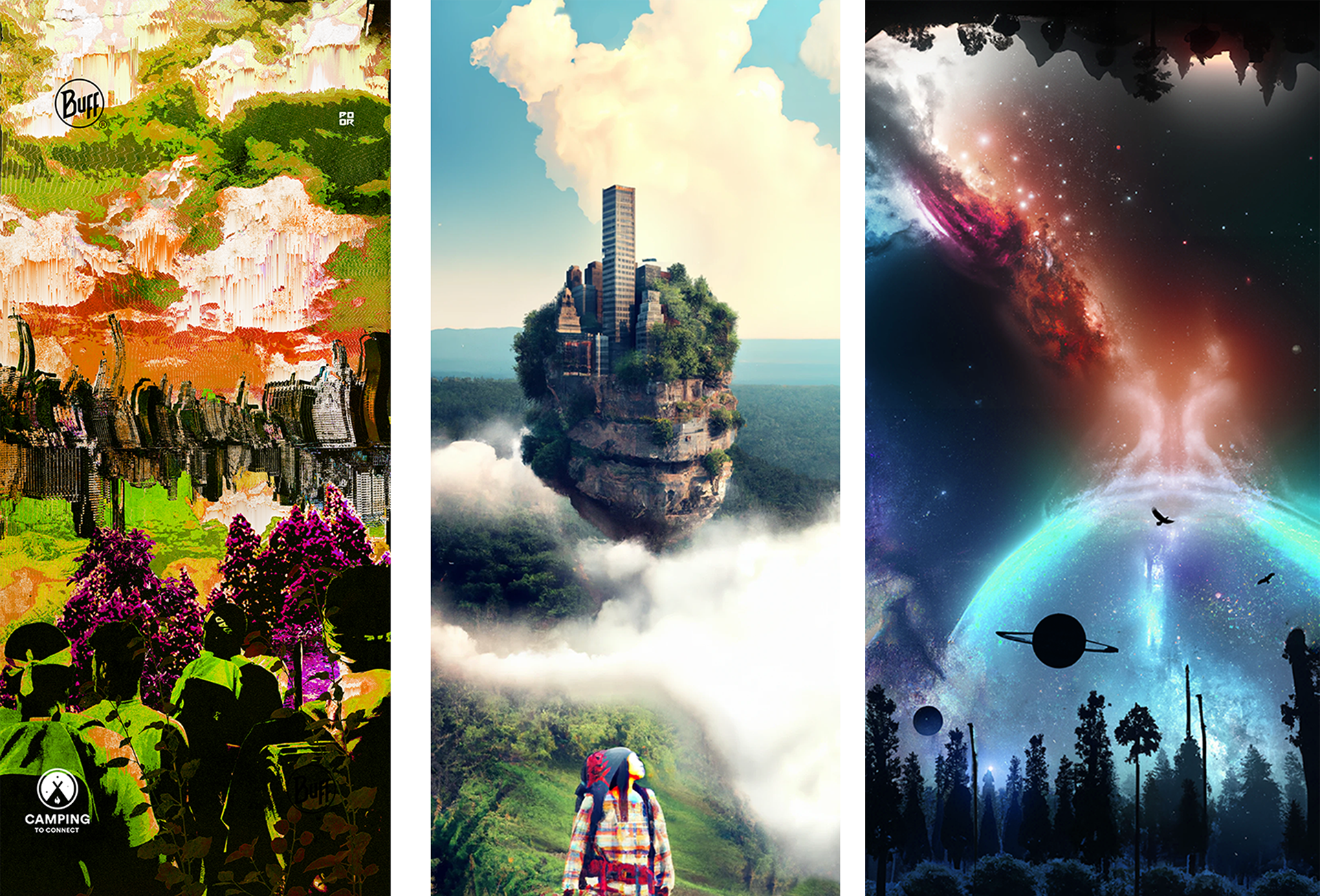 (Far left) The first project was to create a custom multi-use headwear in collaboration with Buff. The goal was to create something that captured the essence of the urban youth in the outdoors.